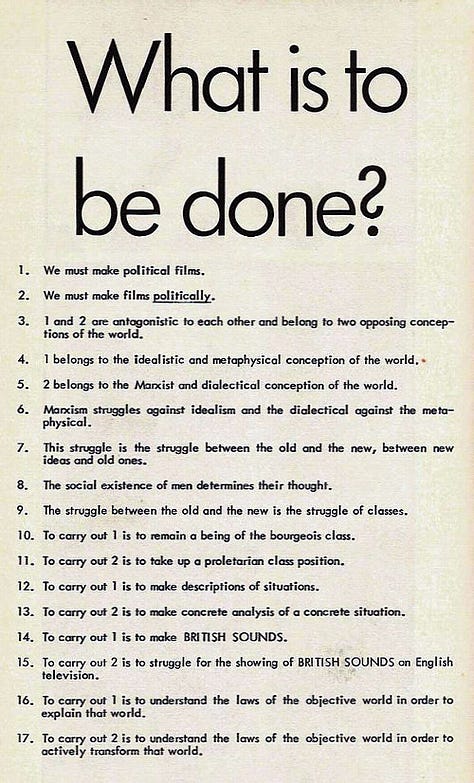 Publicado em Francês com o título de “Que faire?” Em “Jean-Luc Godard: Documentos”, 2006.
